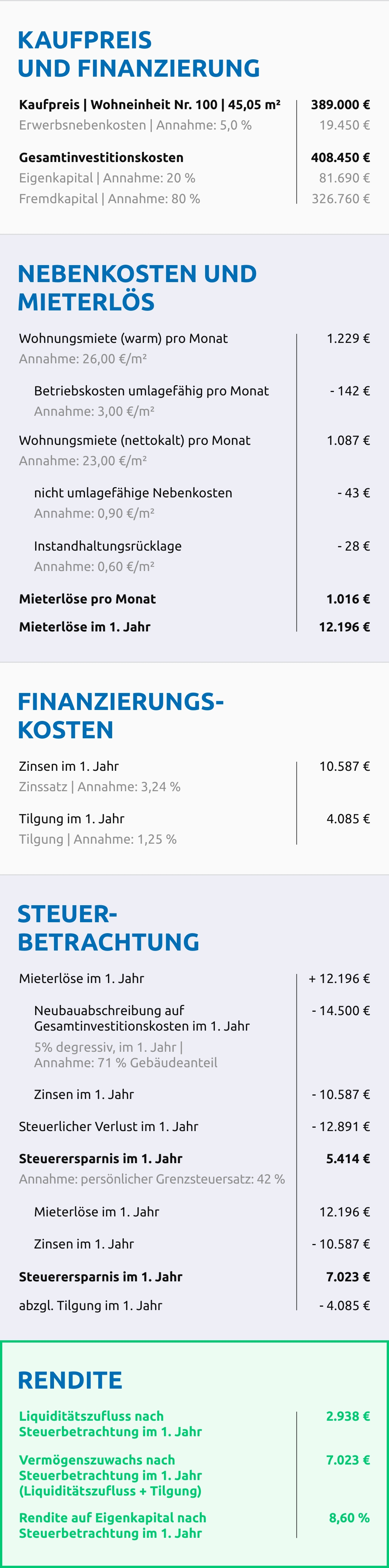 Alle Angaben sind unverbindlich. Das obige Berechnungsbeispiel der Wohneinheit Nr. 100 kann die steuerliche Betrachtung des 1. Jahres darstellen. Wir bitten Sie dies ebenfalls von Ihrem Steuerberater überprüfen zu lassen.